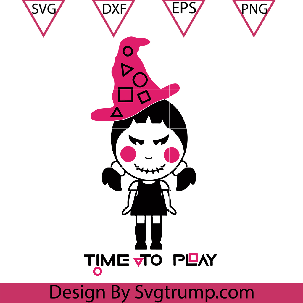 Step into the arena with a twist! Our Squid Game Witch Doll SVG combines the viral intensity of the hit series with the spooky vibes of Halloween. This design features the famous giant doll (Young-hee) wearing a geometric-patterned witch hat, accompanied by the menacing text “TIME TO PLAY.” It is the perfect design for horror fans, K-drama lovers, and anyone looking for a unique DIY costume or craft project this season.
